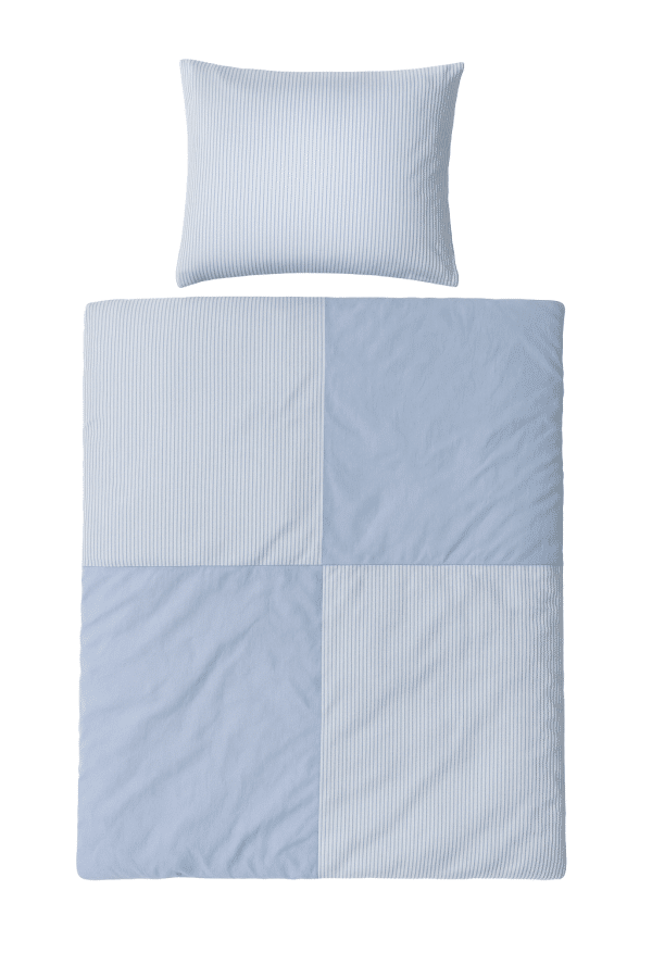 Mini Strib Patchwork sengetøjet fra Omhu er et lyseblåt patchwork sengetøj. Sengetøjet er designet med tern i striber og ensfarvet lyseblåt.